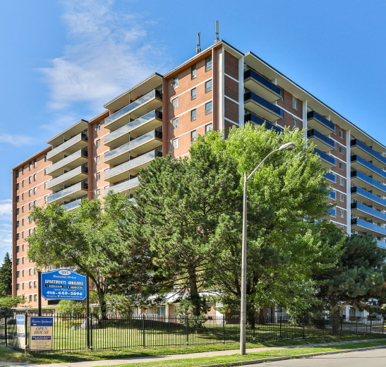 The buildings are in North York, Toronto, at the Victoria Park Avenue and Rowena Drive intersection, near many neighbourhood amenities. You will find yourself close to shopping malls, churches, the library, and public transport right outside your door on Highway 401 and DVP.